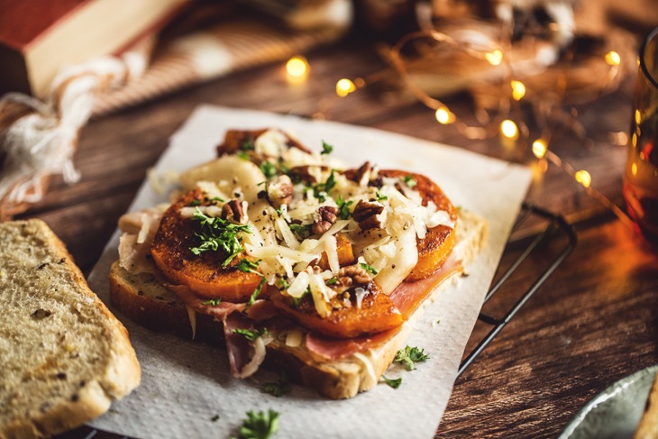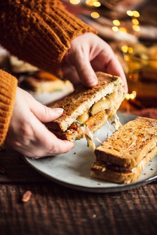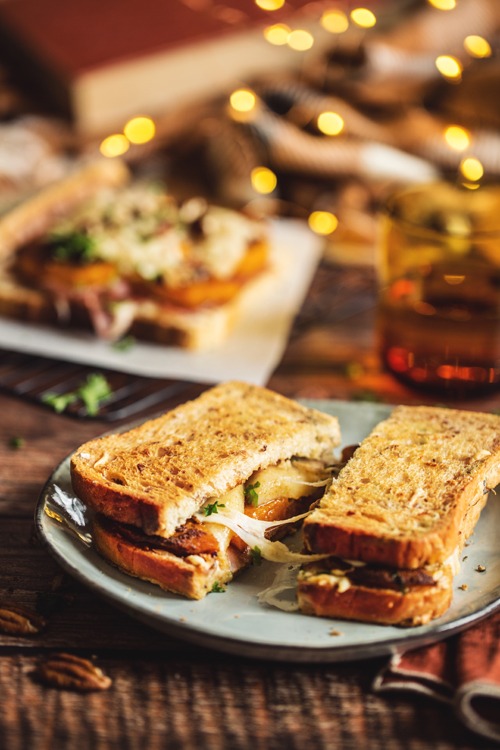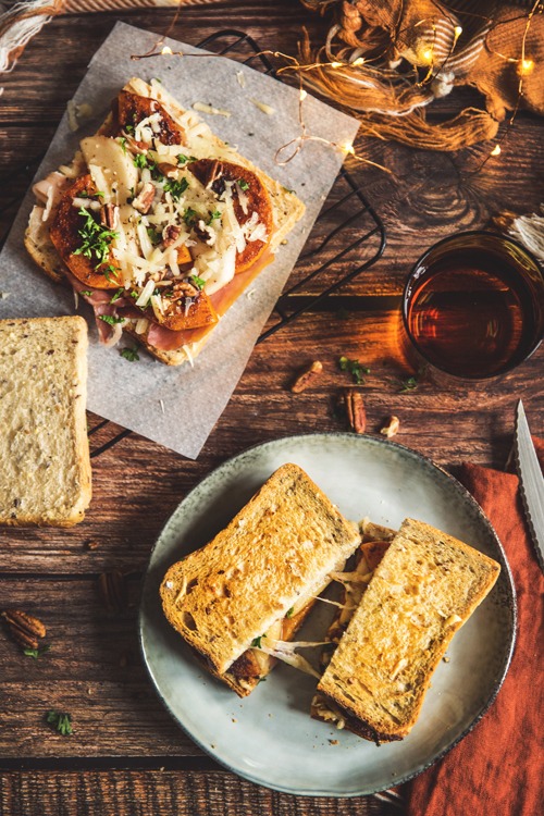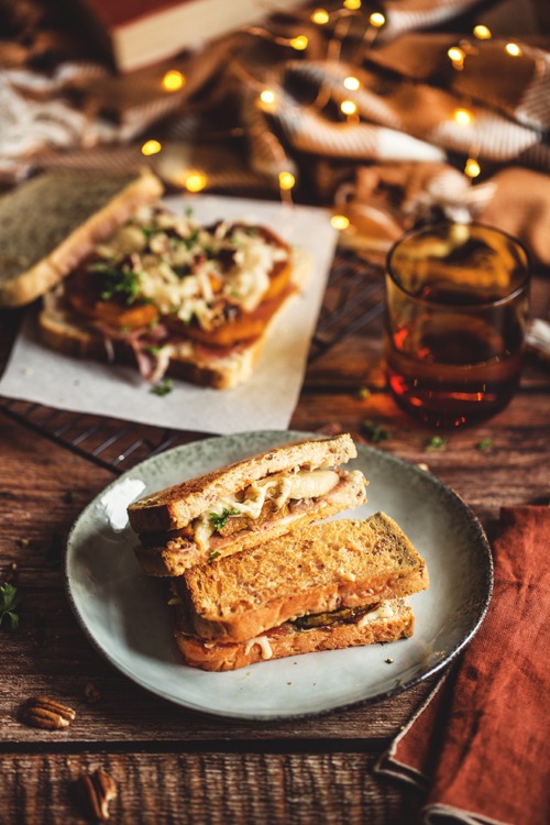 J’ai mêlé des tranches de butternut rôties au paprika fumé, de la poire juteuse, de l’emmental, du jambon cru… et, parce que j’adore ça, une petite poignée de noix de pécan pour le croquant. Le tout entre deux belles tranches de pain grillé bien doré. Et si vous aimez les recettes encore plus gourmandes : j’ai testé une version avec du fromage à raclette, et c’est juste une dinguerie !